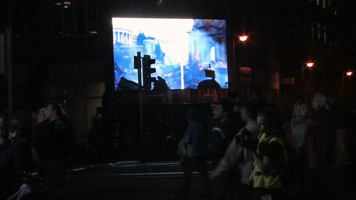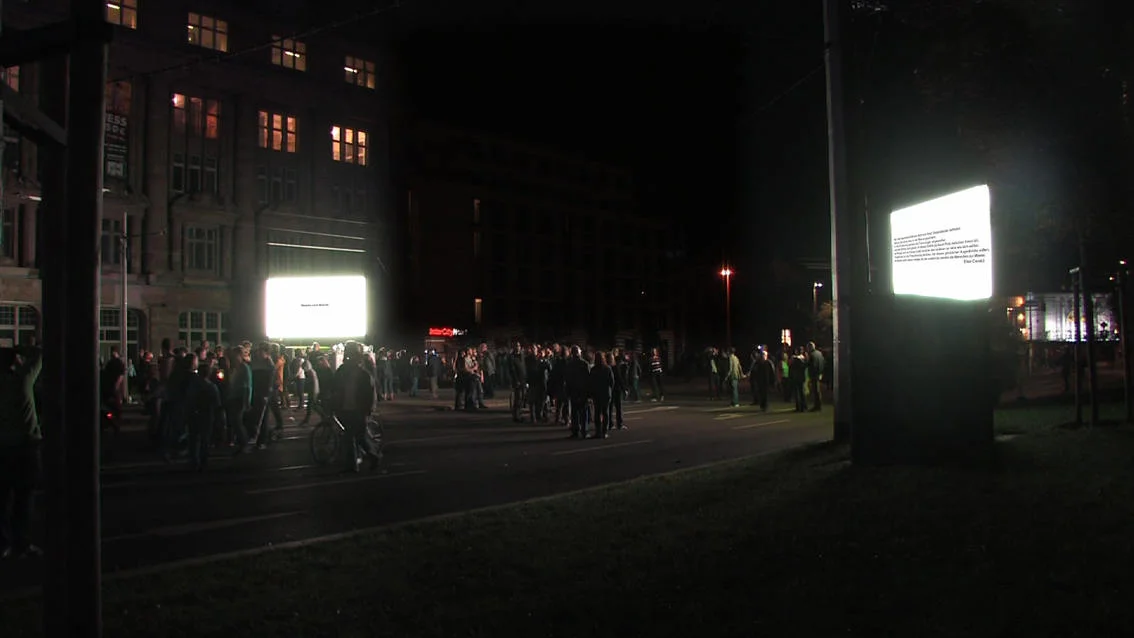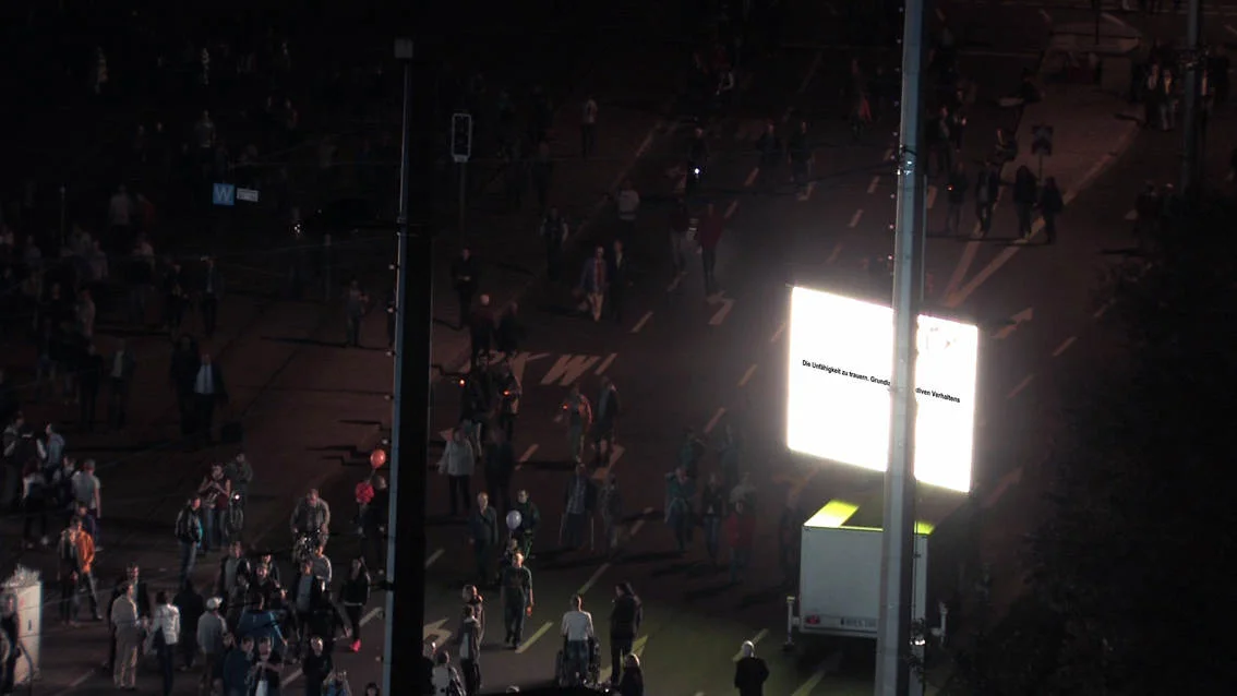 This video / sound installation examines the slogan “We are the people” with regard to its social relevance in 1989 and today, focusing on its inherent meaning in the light of the misuse it experiences from society and the media, on the one hand, and its romantic idealisation on the other. At the same time the piece inquires into the current state of affairs in Europe and discovers the local in the European context, and vice versa.